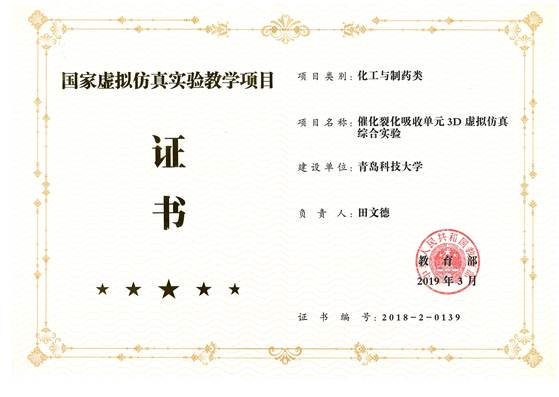 2019年,本中心开发的“催化裂化吸收单元3D虚拟仿真综合实验”被教育部认定为国家虚拟仿真实验教学项目(教高函[2019]6号)。
