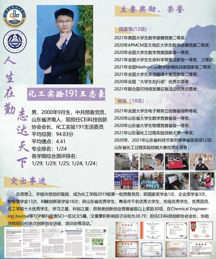 王志豪,中共预备党员,化工实验191班生活委员、舍长、CEI科技创新协会会长。综合测评排名:1/29,1/29,1/25,1/24,1/24。