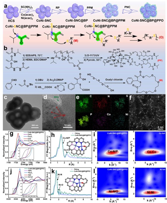 图1. a) CoNi-SNC@BP@PPO的制备示意图(上图),以及PPO聚合机制的示意图(下图)。b)有机PP和M的合成过程。c)透射电子显微镜(TEM)图像,d)高分辨透射电子显微镜(HR-TEM)图像,e)能谱映射图(EDS Mapping),f) CoNi-SNC@BP@PPM的高角环形暗场扫描透射电子显微镜(HAADF-STEM)图像。结构表征包括X射线吸收精细结构(XAFS):g)钴(Co)K边的归一化X射线吸收近边结构(XANES)光谱,h) Co的扩展X射线吸收精细结构(EXAFS)拟合结果,插图为示意图,i) Co的加权小波变换XAFS(WT-XAFS)等高线图,j)镍(Ni)K边的归一化XANES光谱,k) Ni的EXAFS拟合结果,插图为示意图,l) Ni的WT-XAFS等高线图。