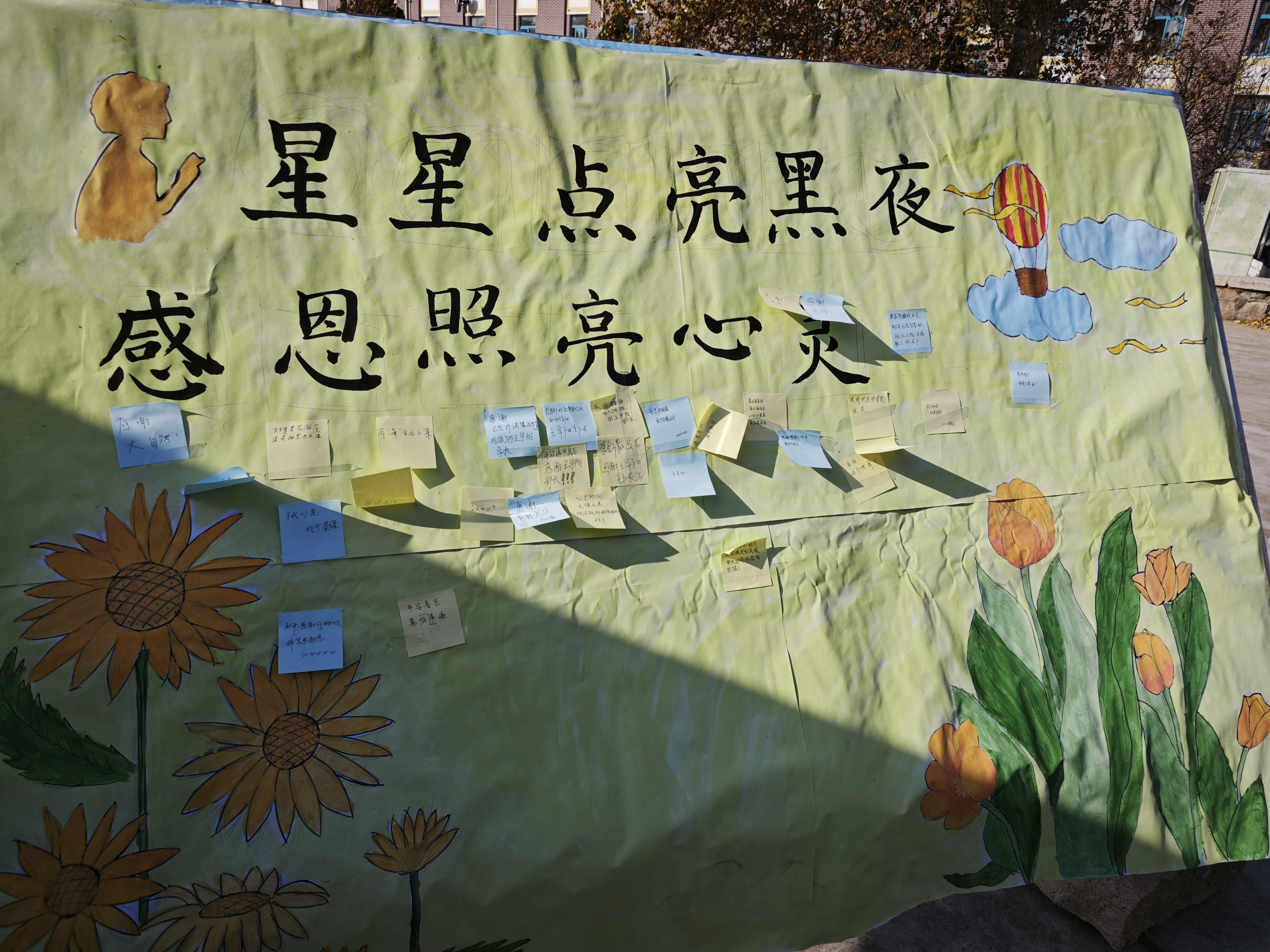 同学们在小五四广场的展板上写下对家人、老师、同学等人的感谢,简短的语句不仅表达了同学们的心声,也传递了感恩的正能量。