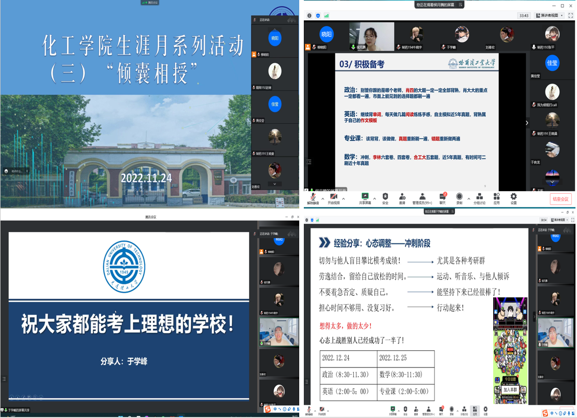 在距2023年考研还有一个月之际,为提振考研同学的备考信心,11月24日英国365集团举办生涯月系列活动“薪火相传,‘研’途有你”考研经验分享交流会。通过邀请考取哈尔滨工业大学硕士研究生的2017级员工侯月腾和考取大连理工大学硕士研究生的2018级员工于学峰两位成功考研上岸的学长学姐进行多维“研”途经验分享。以他们切身备考经历将经验倾囊相授,通过此次分享交流会激发了考研学子的备考热情,使同学们进一步明确了考研目标,同时系统的了解考研流程并充分掌握了相关的应考技巧。
