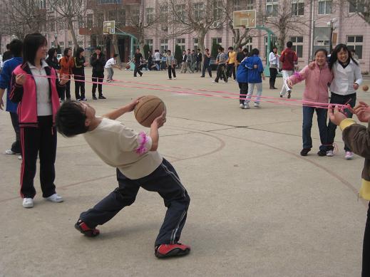 该活动设有三个环节。第一环节是“玩转篮球”。它以队友间的默契合作为基础,要求一人屈膝仰面钻过障碍线后,将球传给单脚绑在一起的两名队员,再由他们将球运给场地另一侧的投球手,投球手每投进一球得2分。第二环节为“疯狂足球”。在此环节中,队员必须将球踢进场中的圆圈,并且使球恰好停在指定区域内。队员们不仅要掌握合适的角度和力度,还需要考虑风向等外在因素。第三环节“我晕”也别具特色,队员们以一定速度原地旋转30s后投篮,进球、碰板都将得到相应的分数。比赛在队员们的共同努力下井然有序的进行着,在欢声笑语中落下了帷幕。