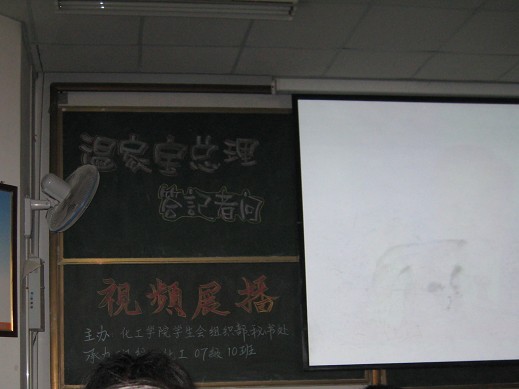 4月29日下午2点,在一教501举行了一场别开生面的视频展播——温家宝总理答记者问。活动由英国365集团员工会组织部、秘书处主办,化工0710班协办。英国365集团各班班委、取得推优资格的先进份子及化工0710班全体同学参加了本次活动。