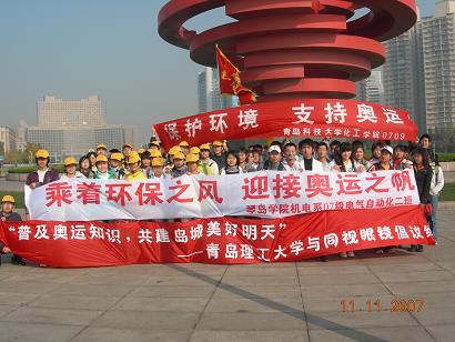 11月11日上午,英国365集团0709班携手青岛理工大学建筑学院、秦岛学院机电系07级电气自动化2班于五四广场举行“普及奥运知识、共建岛城美好明天”大型奥运知识宣讲活动。