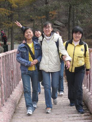 60余名同学分成几个小组分别由山脚向海拔1000多米的山顶前进。一路上虽然山路崎岖、陡峭,仍没有阻挡住同学们前进的步伐。大家相互鼓励,相互搀扶,有些男同学主动帮助体质较弱和受伤的同学。同学们沿路游览了太和观、潮音瀑、蔚竹观和“九水十八潭”等著名景区,最终到达山顶的留韵亭。在留韵亭大家纷纷拍照留念。