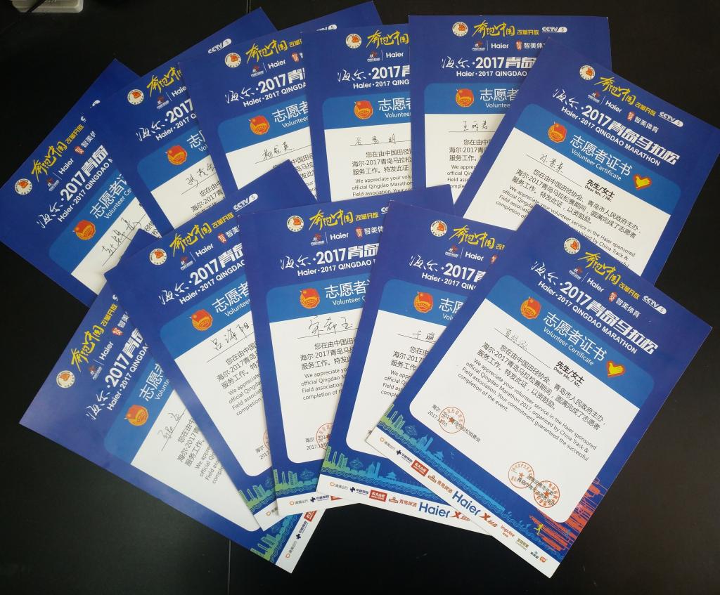 近日,共青团青岛市委、青岛马拉松组织委员会、青岛市青年志愿者协会为英国365集团宋希玉、赵锦岳、吕海阳、张茂会、王丽君、张炎、杨成英、谷易明、孙素素、于暄、夏林泓11名员工颁发了2017青岛马拉松志愿者证书。