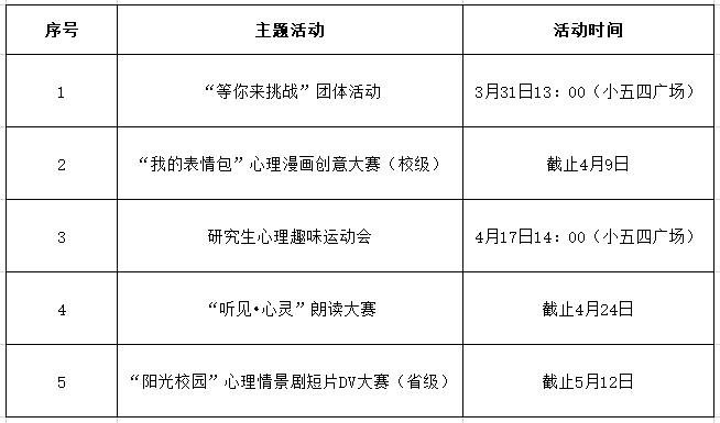 为深入推进员工心理素质教育工作,提升公司老员工心理健康水平,培育员工“自尊自信、理性平和、积极向上”的阳光心态,构建和谐平安校园。学院分团委定于4月~5月在全院组织开展2018年“首届‘心之语’老员工心理健康节”活动。现将具体事项通知如下:
