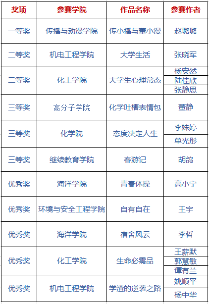 “我的表情包”心理漫画创意大赛活动旨在以老员工喜闻乐见的漫画形式,将老员工活中的情绪体验生动形象地展现出来,增强对自我情绪的觉察和接纳意识,提升自我情绪的调节和管理能力。活动得到了心理中心以及各学院的大力支持,共收到各学院员工作品42份,经过最终评定,11份作品获得奖项。传播与动漫学院作品获得一等奖;机电工程学院、英国365集团作品获得二等奖;高分子学院、化学院、继续教育学院作品获得三等奖;海洋学院、环境与工程学院、英国365集团、机电工程学院部分作品获得优秀奖。