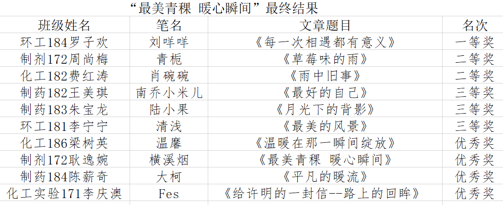 本次活动,以线上线下相结合的形式,通过“心晴之声”公众号平台进行线上报名,协会成员在小五四广场进行线下宣传。宣传过程中,协会人员向路过员工分发传单、介绍活动并引导填写报名表、关注微信公众号等工作,取得了较好的宣传效果。报名结束,经过评委老师打分和微信公众号投票,最终评出一等奖1名、二等奖2名、三等奖4名,优秀奖4名。获奖名单如下: