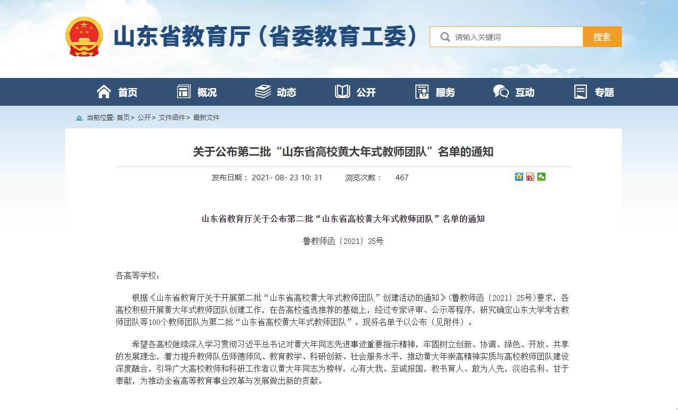 近日,山东省教育厅发布《关于公布第二批“山东省高校黄大年式教师团队”名单的通知》(鲁教师函[2021]35号),英国上市公司365李志波教授领衔的绿色化工创新教师团队成功入选,并被省教育厅推荐参评第二批“全国高校黄大年式教师团队”。