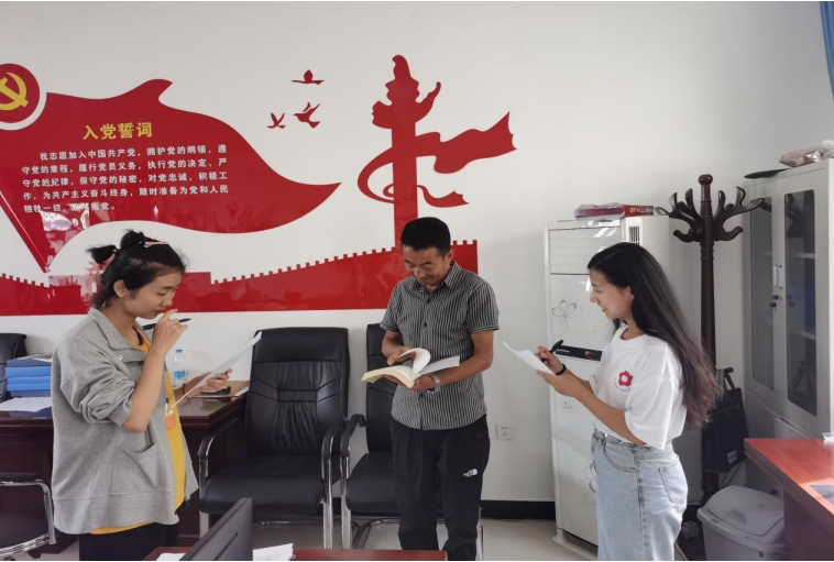 7月25日,团队与当地政府进行对接后,“神州音,华夏情”服务团队前往青海省大通县城关镇,与社区工作者就当地普通话水平和普通话推广活动方面的问题进行交流与讨论。在交流中,团队成员对当地普通话使用状况进行基本了解,当地基层干部认真审阅了团队成员准备好普通话宣讲素材、活动计划及方案,并表示在接下来的实践活动会中积极配合队员开展工作