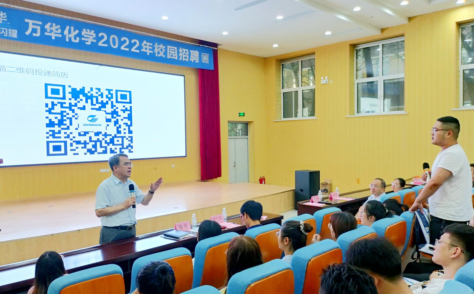 仪式后,万华化学进行2022校园招聘全国高校首场宣讲会,来自四方、崂山、高密三个校区的600余名毕业生参加。赵继德强调,万华化学始终将人才作为公司的第一核心战略资源来培养,为每位员工提供职业与专业导师,帮助员工进行职业规划,尽快熟悉工作,他与在场员工积极交流并耐心回答了大家关注的问题。万华化学招聘经理井雨微女士从万华化学的员工培训成长体系出发,详细介绍了万华化学的企业文化、薪酬政策、员工福利、发展机遇等方面的内容,她讲到公司成立了“万华大学”,为员工提供通用技术、岗位技能、管理与领导力等方面的培训,方便员工进行“自我充电”,不断发掘自身潜能。