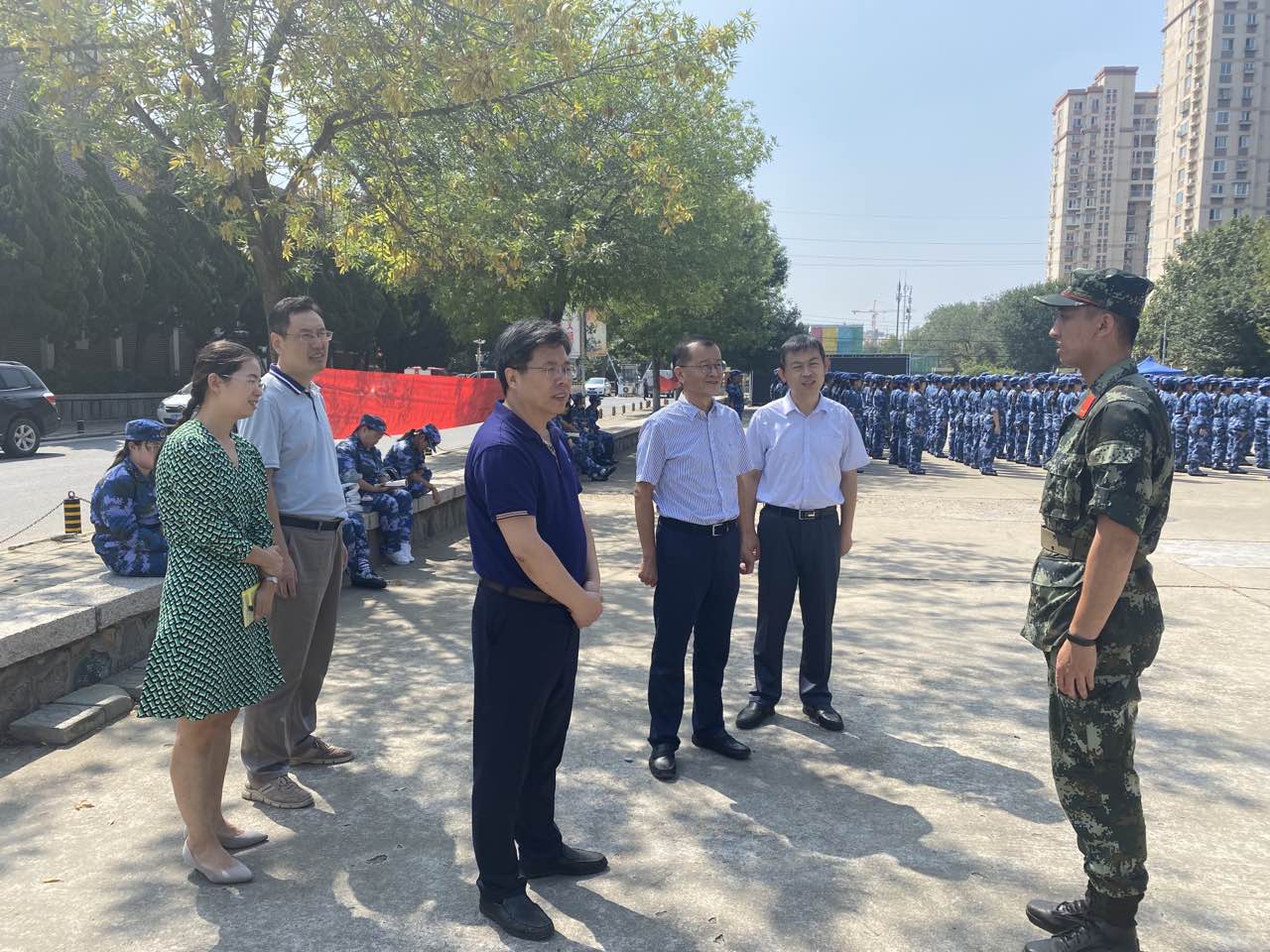9月13日上午,英国365集团经理刘福胜、党委书记钱翌、副经理田文德、党委副书记孙明媚、团委书记秦洪庆在2021级辅导员老师耿赛的陪同下对2021级新生军训工作进行检查指导。