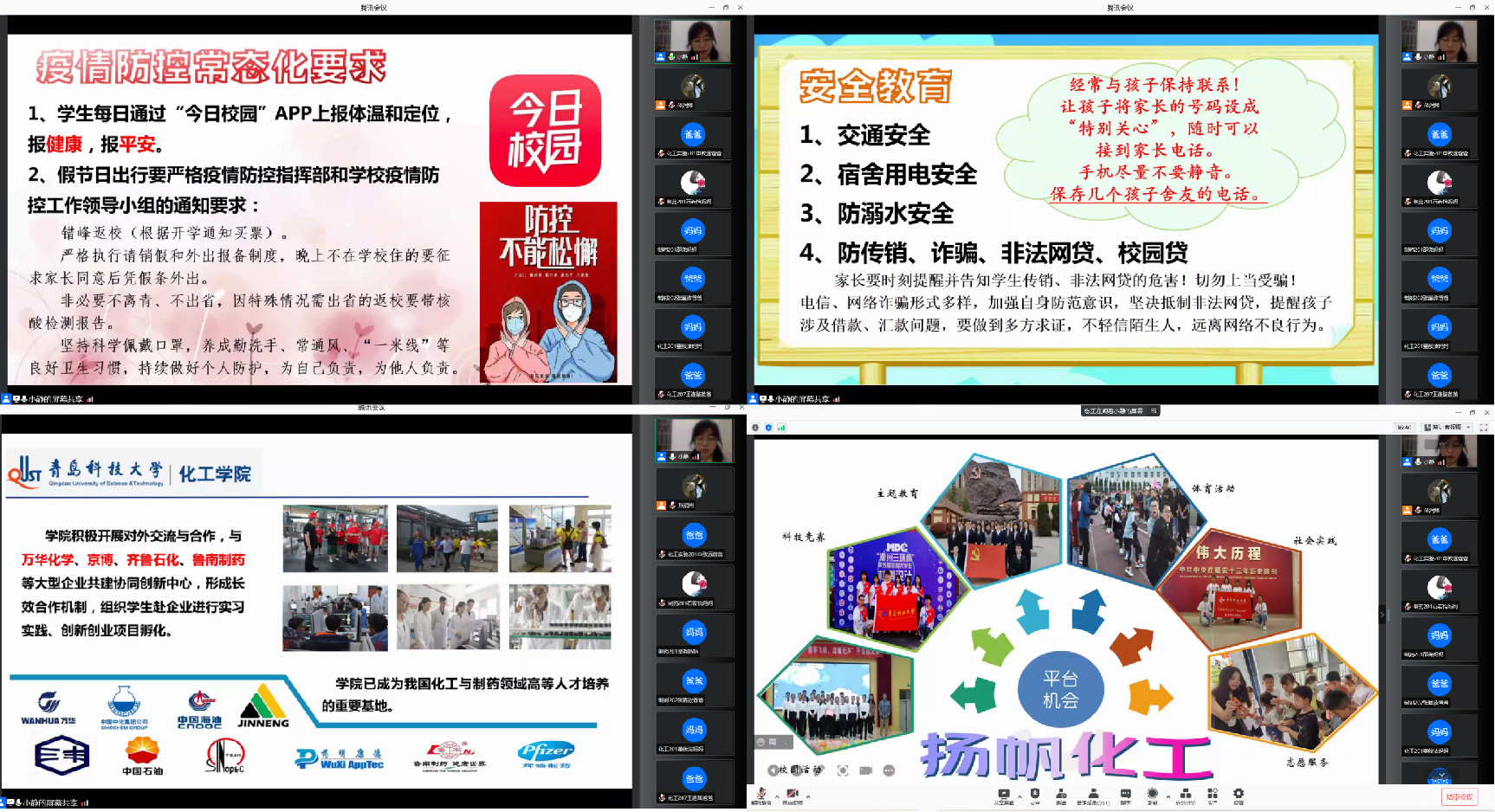 在安全教育方面,付老师提醒各位家长要经常与孩子保持联系,尤其是孩子外出返校后应及时向家长报平安,建议让孩子和家长彼此将号码设成“特别关心”,随时可以接到对方电话,保持信息畅通。在交通安全,宿舍用电安全,防溺水安全,防传销、诈骗、非法网贷、校园贷等方面,付文静对家长们进行安全知识普及,希望各位家长提醒、教育员工重视人身和财产安全,通过学校老师教育、家庭家长关心,达到双向共育目的,保障员工安全健康。