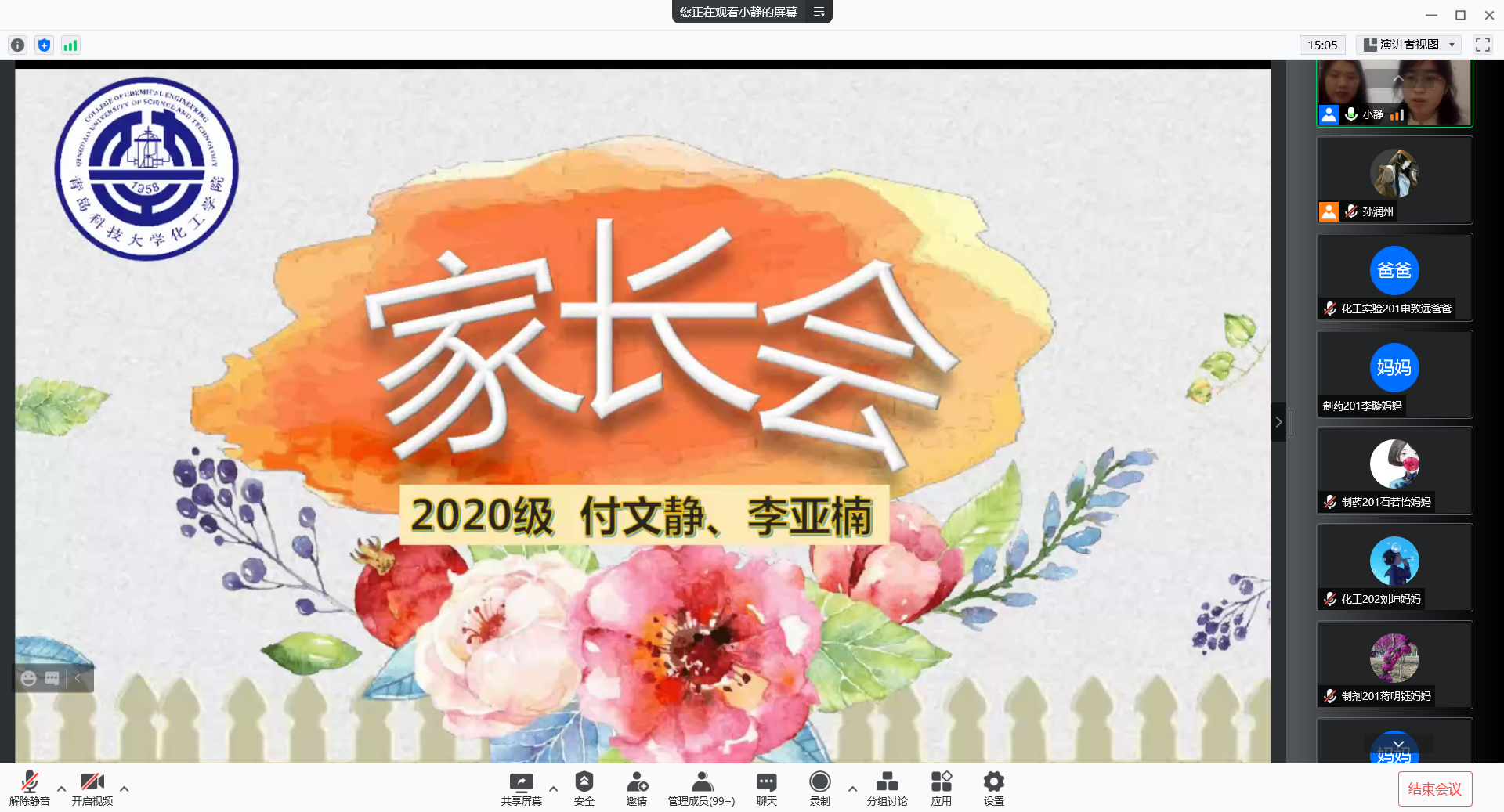 在学习实践方面,付老师解读了学校学籍管理办法和关于学业预警的相关说明,请各位家长多与孩子沟通,知晓孩子的真实学业成绩,关注他们在校的现实表现。付文静还介绍了2021届毕业生考研和就业的情况,鼓励家长与孩子们共同做好生涯规划,通过在校期间的学习、科研、实践等各方面不断的积累,为以后的职业发展做好铺垫。除此之外,付文静还为家长介绍了近期同学们在科技竞赛、主题教育、体育比赛、社会实践等活动中的参与情况,鼓励孩子利用好大学宝贵时光,努力实现自我提升。