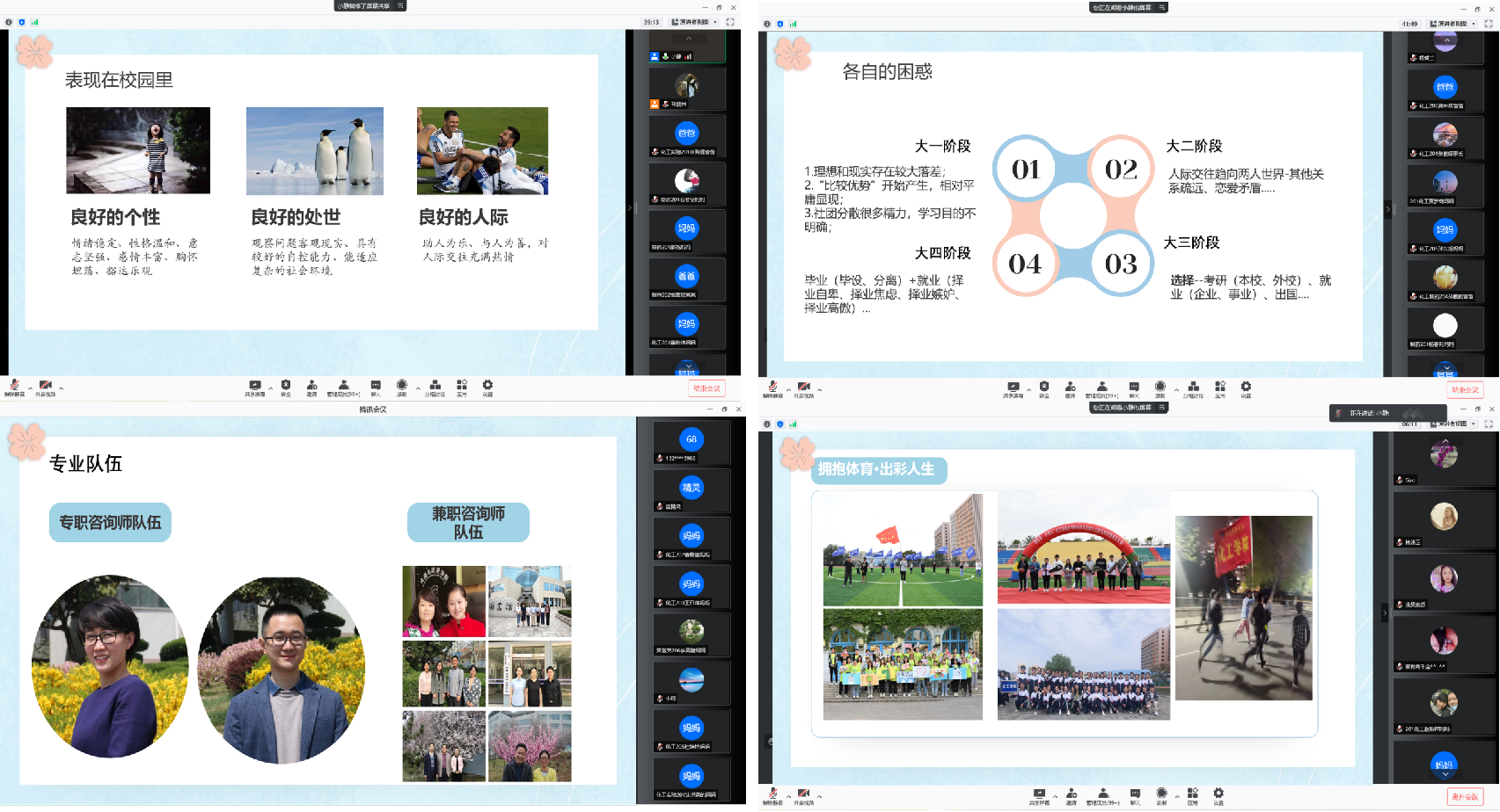 李亚楠介绍了老员工心理健康问题与家校合力做好员工心理关怀的方法径。她着重分析了孩子们在大学各个阶段不同的困惑,热情地向家长提供了多种解决孩子们困惑的建议,带领家长们熟悉学校专业心理咨询方式,介绍了学校心理健康教育与研究中心的基本情况,建议家长留意孩子的情绪变化,及时予以疏导、抚慰和支持,帮助孩子们积极面对,与学校老师一起维护员工心理健康。