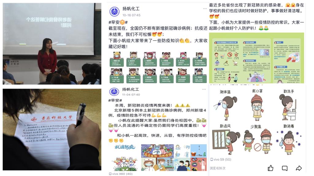 ——用“情”感召,确保宣传引导有“温度”。结合员工特点和需求,开展主题鲜明、内容丰富、受众喜欢的安全和心理健康教育宣讲,让宣传引导有温度、有感召、有实效。在线下,班主任、研究生导师、辅导员用心用情“一对一”开展谈心谈话,深入了解员工的个性特点,精准研判员工学习、生活和成长发展中的困惑、烦恼与迷茫,帮助员工解决困难,化解危机。在线上,学院通过“扬帆化工”和“心晴之声”微信公众号平台持续推送心理健康、生命安全和疫情防控等科普知识,设置“心理篇”“防疫篇”“消防篇”和“防诈篇”等专栏,发布“开学季,你emo吗?”“期中考试即将来临,你紧张吗?”“面对消防安全问题如何紧急处理?”“战‘疫’未停、防控不止”等内容,并针对人际关系紧张、学业困难等典型问题进行专题推送。同时,坚持正面引导与榜样示范相结合,在微信公众号设置“榜样化工”专栏,持续推送成才表率典型、朋辈榜样事迹,将心理与安全教育和榜样教育、感恩教育贯通起来,通过文字、图片和视频等形式展现身边的优秀学子风采,让榜样可见、可寻、可学,以暖心的宣传引导,让育人成效有温度。