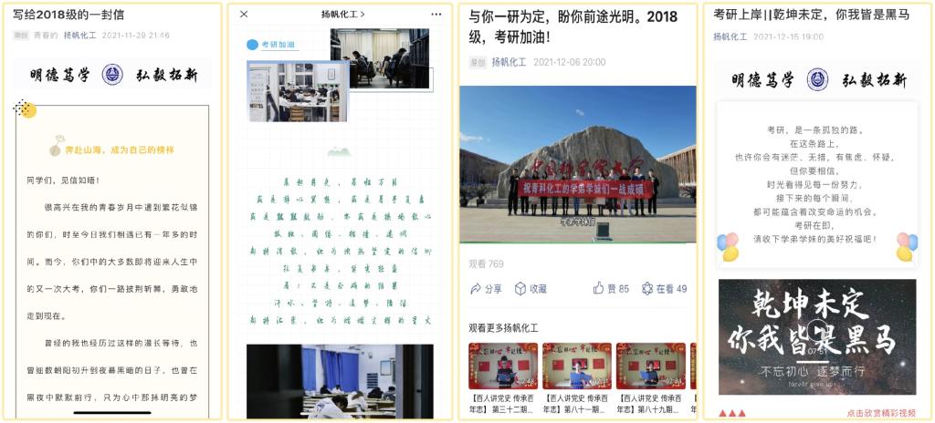 考研进入冲刺期后,学院团委多措并举开展“情暖考研人”系列活动。扬帆化工公众号发布近10篇考研倒计时系列推文,毕业生辅导员为考研学子写下一封鼓励信,优秀毕业生、在校生及辅导员老师分别录制3期考研加油视频,用心守护员工成长,用爱助力梦想起航。
