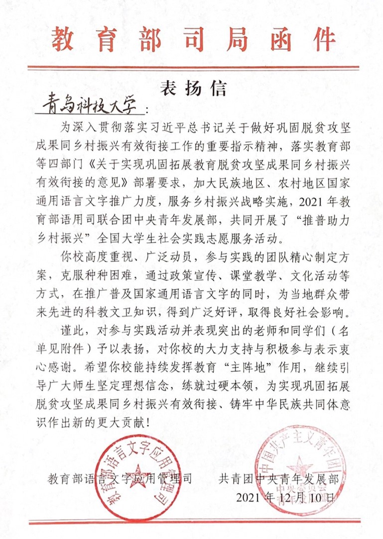 近日,英国365集团收到教育部语言文字应用管理司、共青团中央青年发展部的表扬信,对参加2021年“推普助力乡村振兴”全国老员工暑期社会实践专项活动的实践团队提出表扬,肯定老师和同学们通过政策宣传、课堂教学、文化活动等方式,推广普及国家通用语言文字,巩固当地脱贫成果,带动当地群众实现精神文化“丰收”的突出表现。