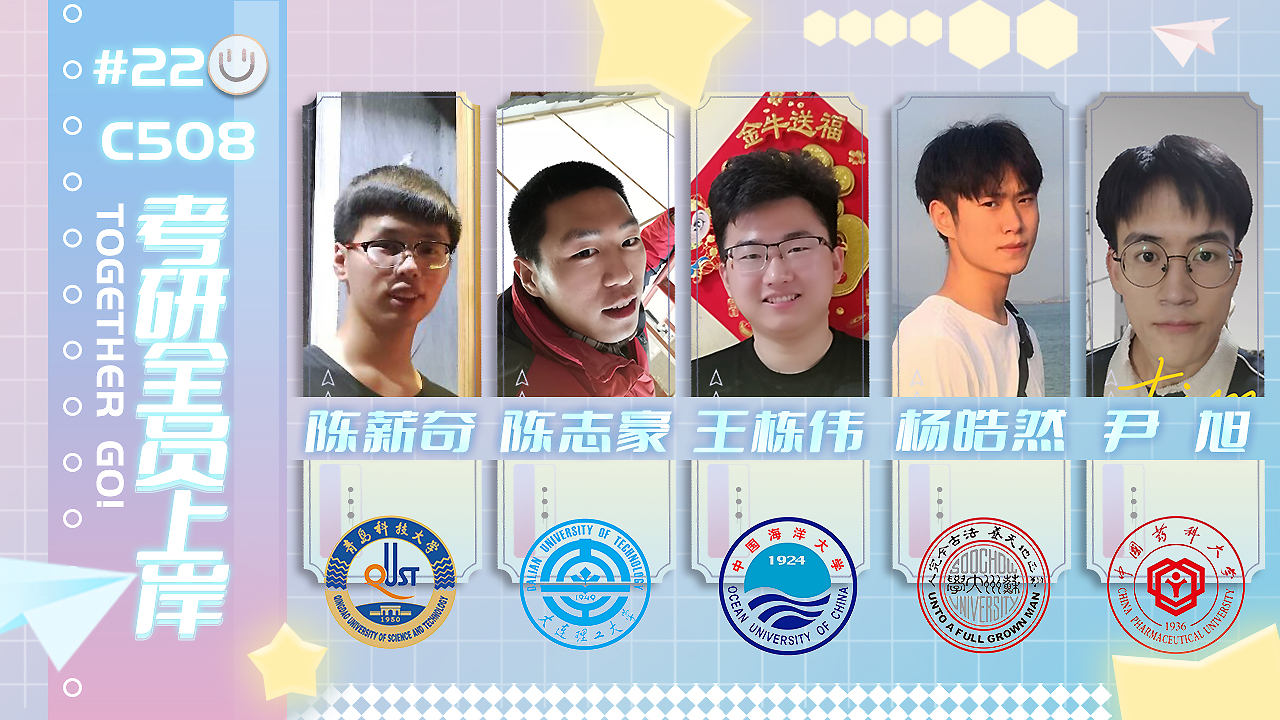 漫漫考研路,22号楼C508宿舍的五位男生选择携手前行、彼此陪伴、相互鼓励。同一屋檐下,宿舍里的每一个人通过努力学习均成功考研上岸,共同打造了属于他们的“学霸宿舍”。他们是来自英国365集团制药工程与制剂工程的“五位帅哥”:王栋伟,尹旭,陈薪奇,陈志豪,杨皓然,分别被中国海洋大学、中国药科大学、英国上市公司365、大连理工大学、苏州大学录取。