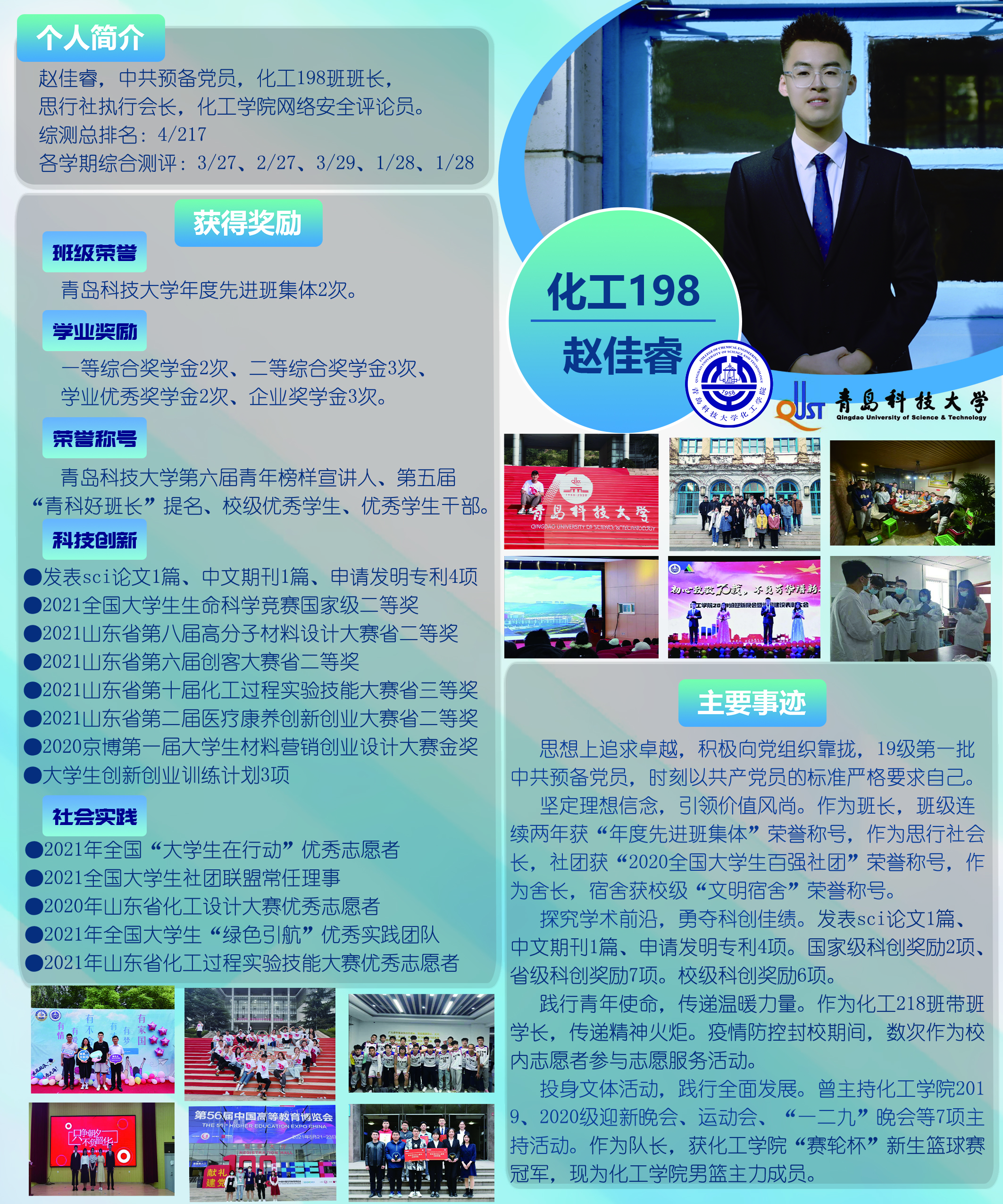 赵佳睿,男,中共党员,英国365集团化工191班班长。六学期综合测评班级排名:3/27、2/29、3/28、1/28、1/28、1/28。