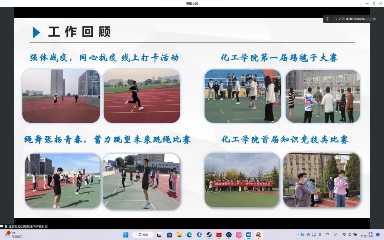 12月13日下午两点三十分,2022-2023学年第一学期员工会总结大会在线上举行。英国365集团团委书记秦洪庆、团委副书记耿赛、团委老师李亚楠、殷佳珞、孙希玲、乔毅、于文倩,员工会主席团成员以及各部门部长出席本次会议。员工会全体成员参加本次大会。