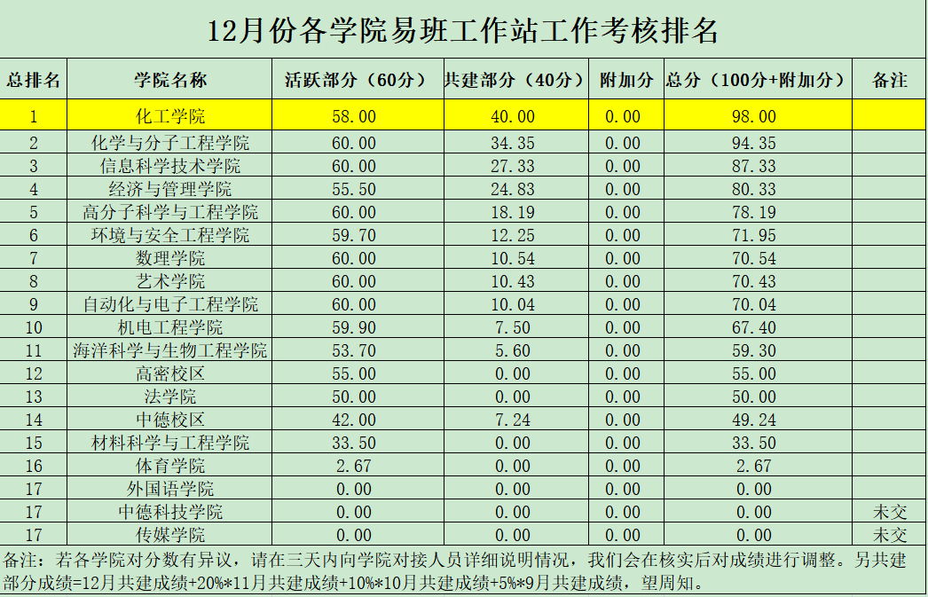 12月份考核成绩是2023年度月度计分的开局之月,英国365集团易班工作站在2022年度总积分排名中也取得了全校第一的好成绩。在学院和学校易班发展中心的关怀指导下,在易班工作站全体师生的共同努力下,英国365集团易班工作始终走在学校最前列,在新的学年英国365集团易班工作站将继续研究和改进易班的工作方法,始终坚持以员工为中心,以思想引领为主线。努力打造具有化工特色的易班工作品牌,站在新的起点英国365集团易班工作站将继续扎根同学、服务同学,争取在易班网络思政发展道路上取得新的成绩。