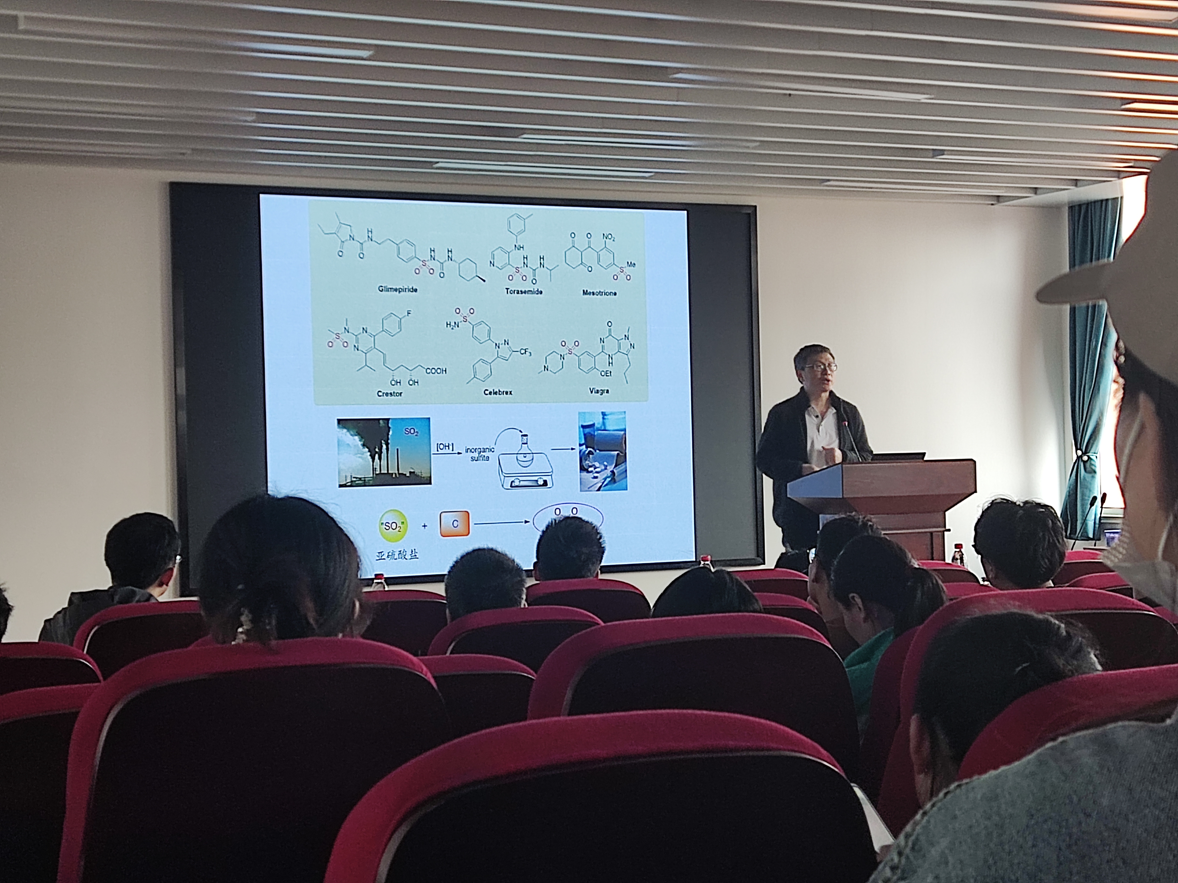 吴劼教授通过介绍二氧化硫的插入反应向有机分子中引入磺酰基片段进而实现自由基的高效转化,展开讲解了行业针对二氧化硫参与转化反应面临的问题。会上,吴劼教授首先对磺酰基片段在各种药物分子及材料分子的广泛应用做出系统阐述,并指出亟需深入解决的问题,随后提出了采用二氧化硫作插入反应的解决想法及新思路,最后详细解释了自由基形成机制及反应特点以及改进磺酰药物的合成工艺。最后,吴劼教授就报告主题与现场师生进行了讨论交流,鼓励并建议同学们在研究新问题要客观深入,探寻机理。