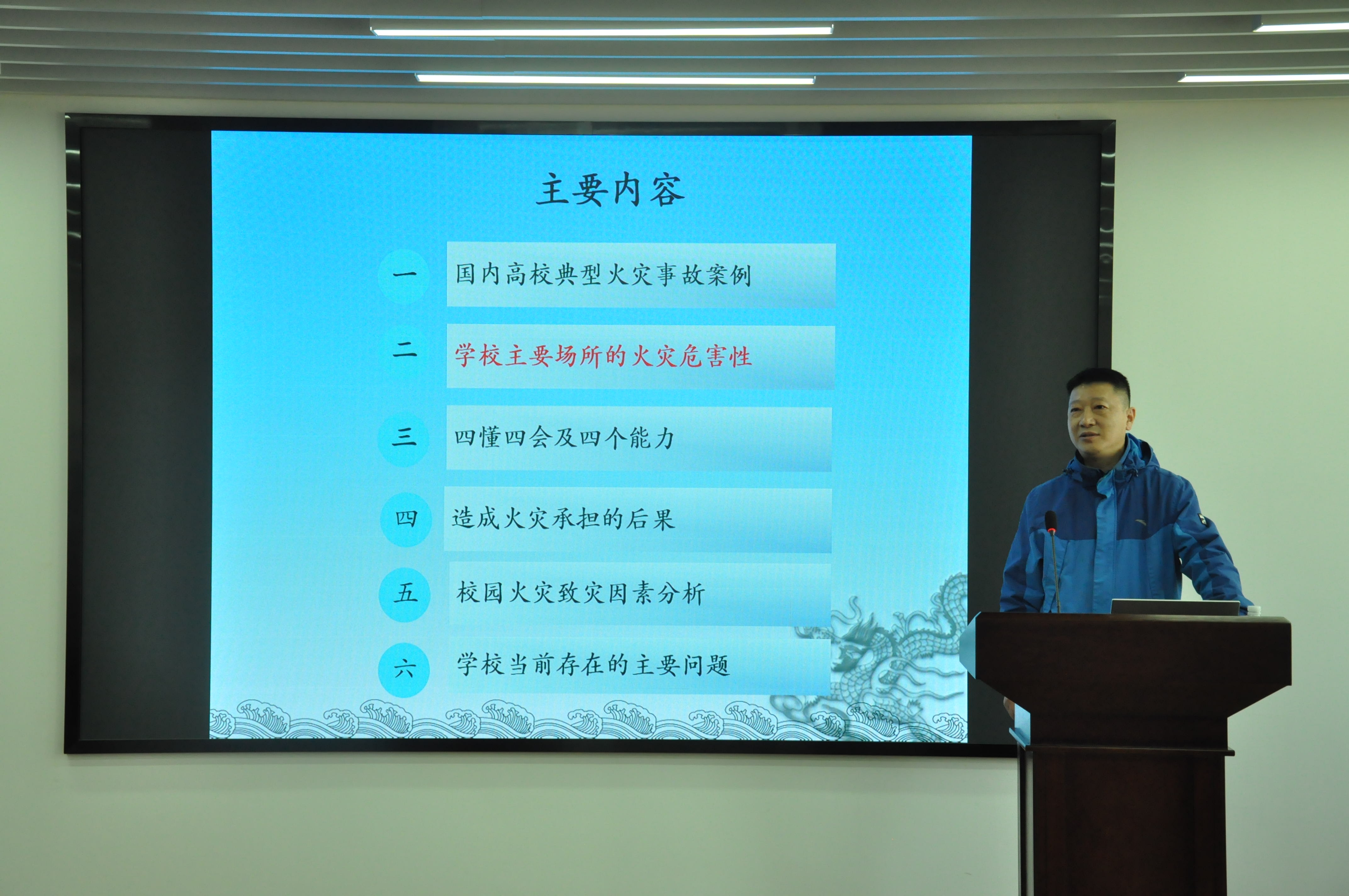 此次活动主要从国内高校典型火灾案例、学校主要场所的火灾危害性、“四懂四会及四个能力”、造成火灾承担的后果、校园火灾致灾因素分析、学校当前存在的主要问题六个方面对同学们进行相关消防知识的强化科普、警示教育及宣传。首先仇立峰列出多个高校发生的火灾案例,并指出学校主要场所如宿舍、实验室等地方的常见消防安全问题,让同学们对于身边的危险有更加清晰地认知。其次,他通过“四懂四会及四个能力”向同学们介绍了灭火措施及逃生方式等,指出了造成火灾需承担的后果,让同学们更加深刻地懂得消防安全的重要性和必要性。最后,他分析了导致校园火灾的因素是用火不慎和电气故障,呼吁同学们提高安全意识,掌握用电安全。