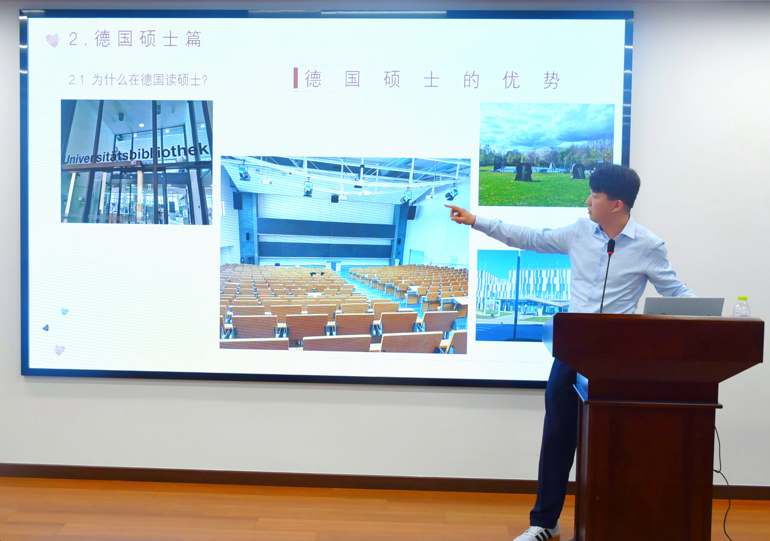 郑军回顾了自己本硕博期间的学习成长经历,对母校表达了感谢。他详细讲解了德国留学的优势和原因,介绍了德国大学授课特色、德国留学申请历程、出国留学的发展前景、如何顺利毕业和后续规划、硕士和博士的日常生活,以及同学们大学本科阶段需要做的准备等内容,并鼓励想要尝试出国的同学现在开始准备出国留学的事宜。