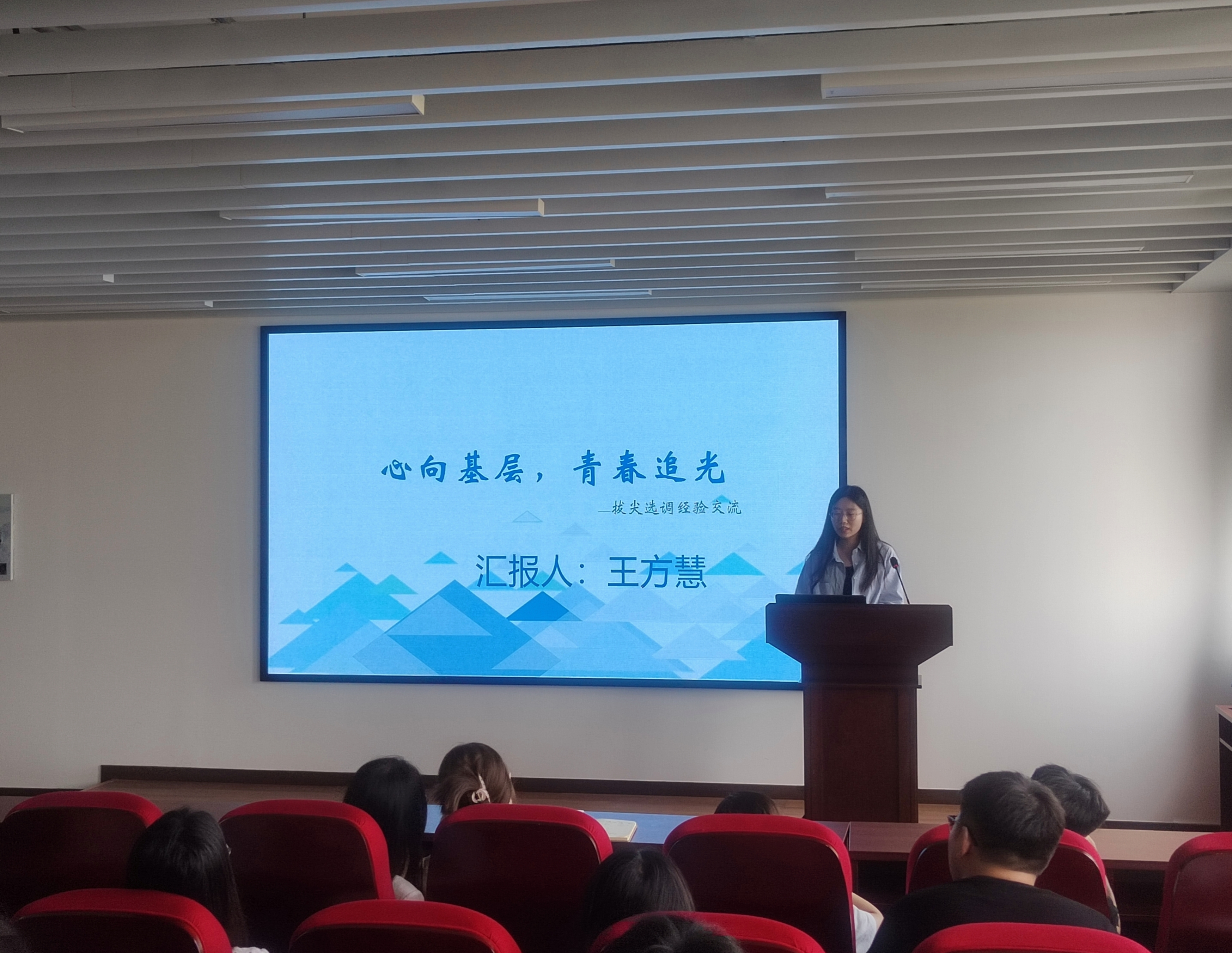 接着,王方慧同学分享了她在拔尖选调方面的经验。她从自身的实际经历出发,涵盖了拔尖选调的定义、申请流程以及笔试和面试的注意事项等多个方面,向同学们分享了宝贵的经验。