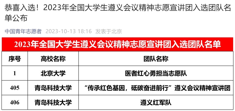 为全面学习贯彻党的二十大精神,深入贯彻落实习近平总书记提出的“传承红色基因、讲好遵义故事”的重要要求,引导青年员工弘扬遵义会议精神,赓续红色血脉,努力成长为担当民族复兴大任的时代新人。2023年9月,团中央青年志愿者行动指导中心、中共遵义市委、共青团贵州省委联合开展遵义会议精神志愿宣讲活动,面向全国高校遴选1000支老员工遵义会议精神志愿宣讲团。