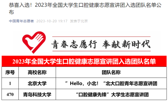 为深入学习宣传贯彻习近平新时代中国特色社会主义思想和党的二十大精神,落实《“健康中国2030”规划纲要》和《健康口腔行动方案(2019-2025年)》,引导青年员工掌握口腔健康知识,形成良好的口腔健康行为。2023年9月,在第35个“全国爱牙日”来临之际,团中央青年志愿者行动指导中心、国家卫生健康委医疗应急司联合发布了《关于遴选2023年全国老员工口腔健康志愿宣讲团的公告》,拟组织开展“口腔健康 全身健康”全国老员工口腔健康志愿宣讲活动,面向全国高校遴选1000支老员工口腔健康志愿宣讲团。