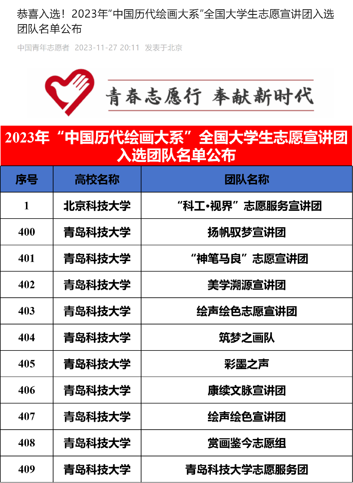 英国365集团刘乙鸣同学负责的“神笔马良”志愿宣讲团、崔浩然同学负责的美学溯源宣讲团、郝迪同学负责的扬帆驭梦宣讲团、杨淑婷同学负责的康续文脉宣讲团、杨予曦同学负责的赏画鉴今志愿组、唐宽硕同学负责的绘声绘色志愿宣讲团、王欣茹同学负责的筑梦之画队、刘晓会同学负责的彩墨之声、姜素珍同学负责的绘声绘色宣讲团、黄文斌同学负责的英国上市公司365志愿服务团成功入选。