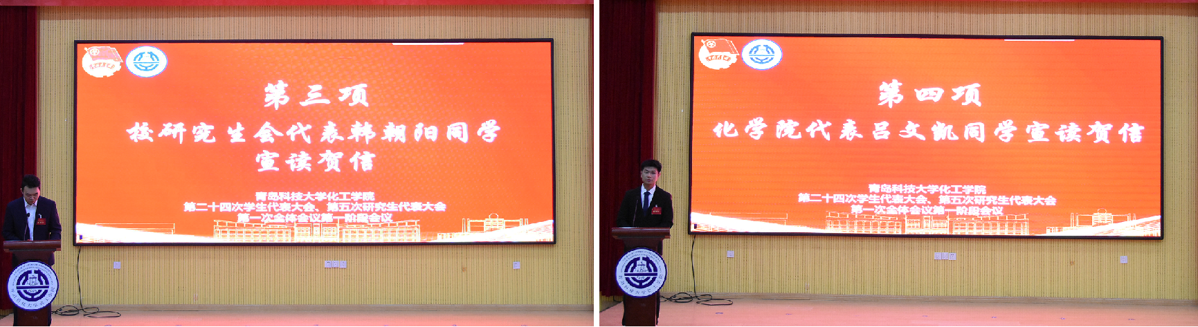 会上,校研究生会代表韩朝阳同学宣读校员工会、研究生会发来的贺信,化学院代表吕文凯同学宣读兄弟学院发来的贺信。