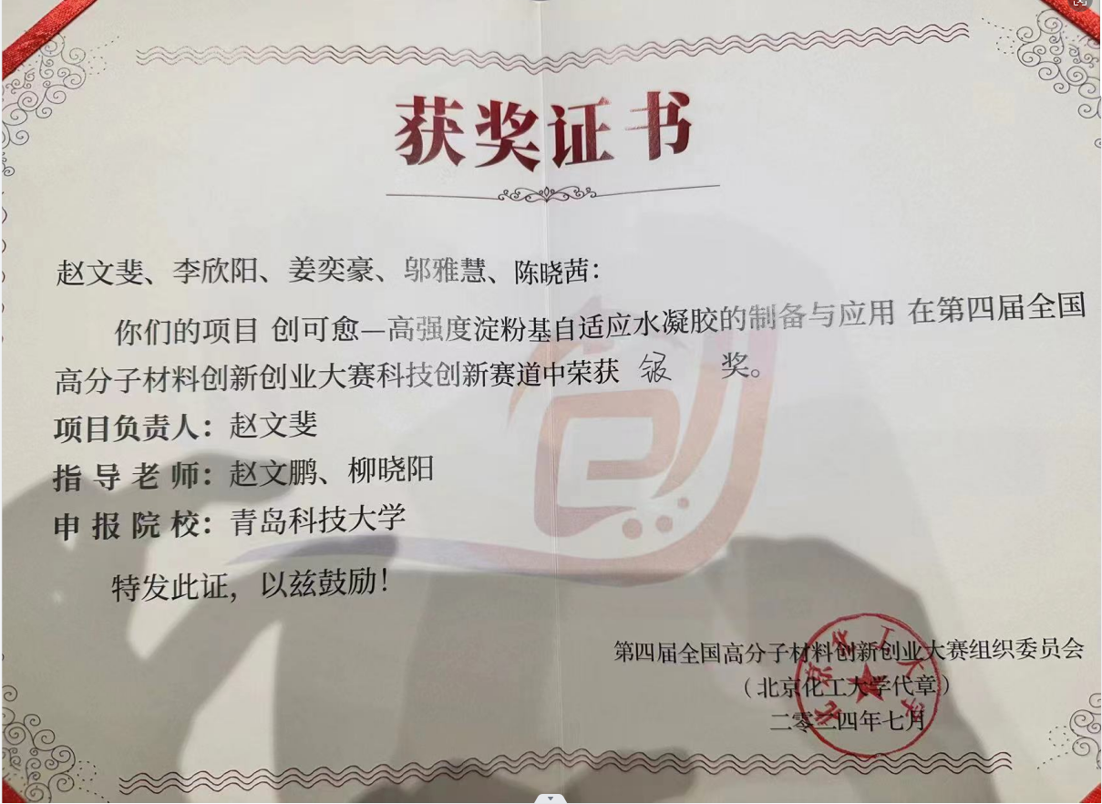 7月13日,第四届全国高分子材料创新创业大赛在北京化工大学举行,由赵文鹏老师指导、化工235班赵文斐同学负责的项目《创可愈—高强度淀粉基自适应水凝胶制备与应用》获科技创新赛道银奖。