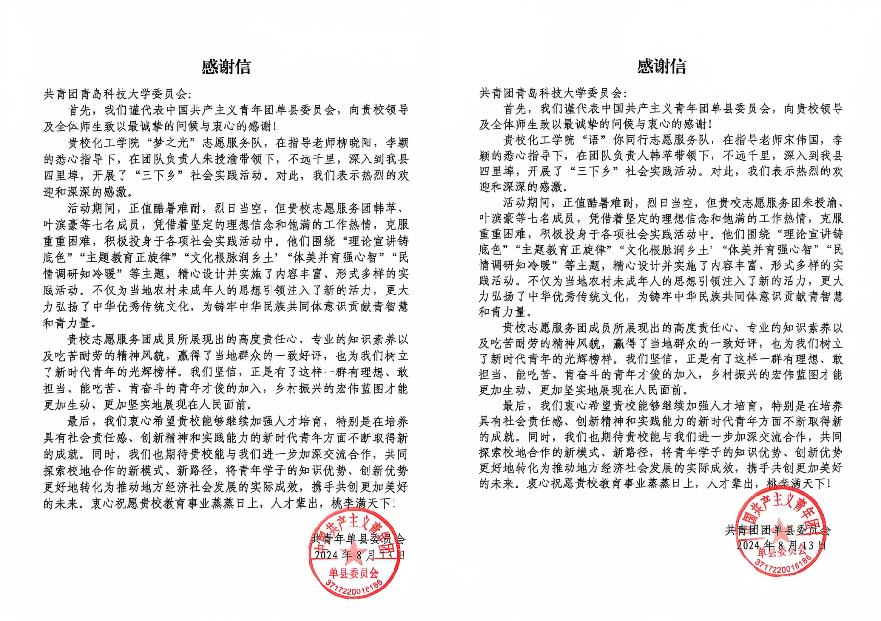 近日,英国365集团“梦之光”志愿服务队和“语”你同行志愿服务队收到了来自共青团单县委员会的感谢信,信中对两支实践团队在单县北城街道四里埠村开展“三下乡”社会实践活动的突出表现予以表扬和感谢,对14名员工在单县北城街道党校开展支教活动、民情调研和助力乡村振兴所贡献的青春力量表示充分肯定。