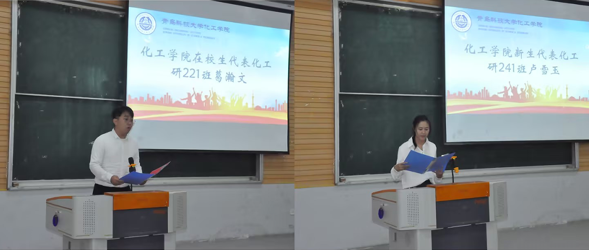 在校生代表22级葛瀚文与大家分享几点研究生阶段的感悟与思考,呼吁大家要以饱满的热情、坚定的信念,开启这段精彩纷呈的研究生旅程。新生代表24级卢雪玉讲述了自己一年支教团的经历,倡议大家要弘扬“科大精神”,践行“橡胶品格”。