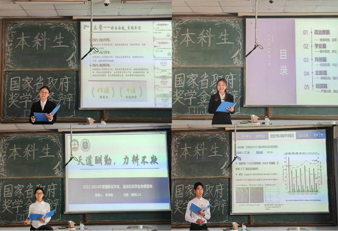 答辩会上,11名同学李冰艳、郭佳慧、王禹铮、荣维迪、杨淑婷、郑瑞婧、赵文斐、王学飞、张锦蕾、孙雨瑄、潘如玉依次进行答辩。各参赛选手详细介绍了自己在学业成绩、科研成果、社会实践、思想政治等方面的突出表现。他们满怀底气与自信,向评委展示了自己全面发展的风采,同时也对在场同学们起到了榜样示范作用,展现了青科学子的风貌。