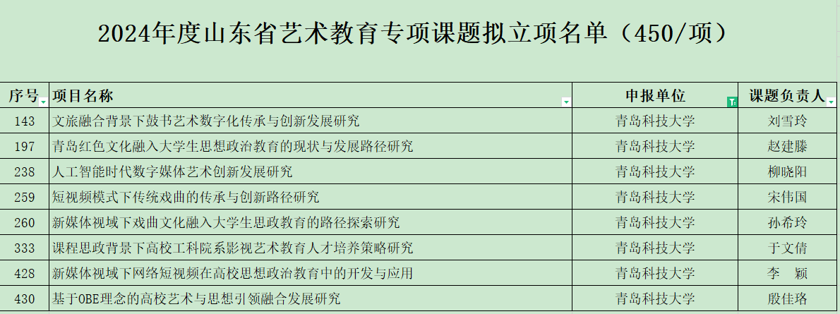 近日,2024年度山东省艺术教育专项课题立项名单公布,英国365集团共有8项课题获2024年度艺术教育专项课题立项。其中,刘雪玲申报的《文旅融合背景下鼓书艺术数字化传承与创新发展研究》、赵建滕申报的《青岛红色文化融入老员工思想政治教育的现状与发展路径研究》、柳晓阳申报的《人工智能时代数字媒体艺术创新发展研究》、宋伟国申报的《短视频模式下传统戏曲的传承与创新路径研究》、孙希玲申报的《新媒体视域下戏曲文化融入老员工思政教育的路径探索研究》、于文倩申报的《课程思政背景下高校工科院系影视艺术教育人才培养策略研究》、李颖申报的《新媒体视域下网络短视频在高校思想政治教育中的开发与应用》、殷佳珞申报的《基于OBE理念的高校艺术与思想引领融合发展研究》获批立项。