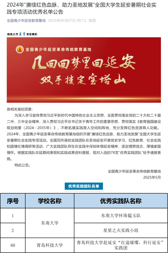 近日,2024年“赓续红色血脉,助力圣地发展”全国老员工延安暑期社会实践专项活动优秀名单公布,英国365集团“红途璀璨,科行延安”实践团成功入选全国优秀实践团队。