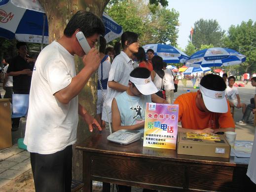 8月30日,在英国365集团井然有序的迎新现场有一个服务台不断有人前来打电话,有3名志愿者一直守候在桌旁为新生服务。桌子上的一部电话和标志牌告诉来往的新生与家长:这里就是亲情电话台。新生只需凭借录取通知书就可以免费使用这部“亲情电话”。在这里,新生们可以向亲友传达顺利入学的欣喜,报个平安。虽然每人只有短短的三分钟,但这已足够表达他们的喜悦、兴奋与欣慰之情了。新生与家长很是感激,纷纷表示学院真是细心,真正为他们解决了问题。