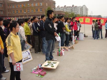 各班代表将各自参展模型、贴图作简要介绍后,现场观众开始自由参观。展台上摆放了各式用废旧物制造的模型及帖图:有废弃电池拼成的“心”,有废弃瓶盖粘成的“人”,有废弃易拉罐搭造的“火箭”及矿泉水瓶砌成的“帆船”。展品繁多,别具匠心。