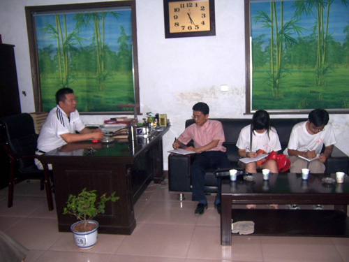 杜家村党支部书记杜卫东先生亲切接见了到访的志愿者们,他代表1000多名村民对服务团的到来表示热烈的欢迎。座谈会上,他首先向志愿者介绍了关于杜家村的基本情况和当地的经济发展情况。随后,他向志愿者介绍了杜家村在环境保护方面所做的大量工作。他说,自05年新一届村委领导班子成立以来,做了两件最受百姓欢迎的事情:一件是提高了村民在各个方面的福利待遇;另一件就是加强了对村内及其周边地区的环境整治工作。