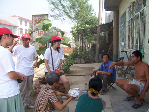 在此次访谈活动中,志愿者走访了九户当地居民,向他们详细询问了当地企业、工厂等生产单位对大气、水、土壤的污染情况,了解了当地在环境保护方面的政策和采取的措施,拿到了当地关于环保方面的第一手资料。随后,志愿者向每户居民赠送了环保宣传手册,并向村民介绍我国在环境保护方面的政策法规和可持续发展战略的基本国策。同时,志愿者向当地居民询问了当地关于在新农村建设方面的进展。据村民杜大爷介绍,杜家村在近年来发展很快,在环境保护方面村委会也做出了很大努力,但由于当地在环保方面起步较晚,认识不够等原因,还有一些地方仍需要改进。