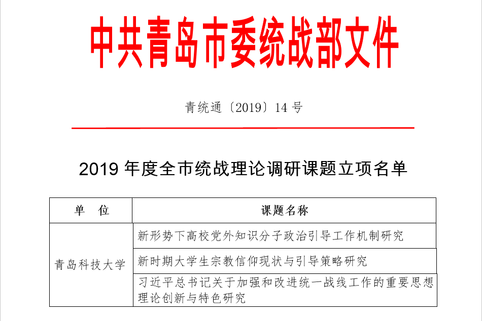 据悉,青岛市委统战部《关于做好2019年全市统战理论研究工作的通知》(青统通〔2019〕12号)印发后,各单位高度重视,积极部署,广泛参与。经过综合评审,结合工作需要,市委统战部确定立项课题159项。