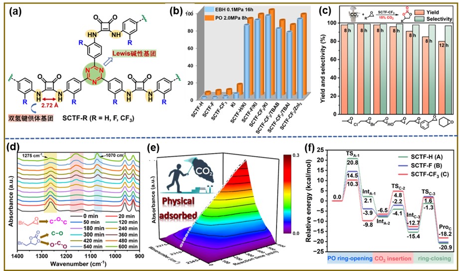 结合原位FT-IR监测和DFT计算,研究了富氮/富氟功能基团引入前后对CO2的吸附活化行为差异,并对整个环加成反应涉及的环氧化物活化开环、CO2嵌入、环化闭环等过程进行了构型优化与能垒计算,深入解析了新催化环境下的反应机理。该工作解决了目前环加成反应中多相催化剂活性低导致的依赖高纯CO2和高温/高压问题。以上研究成果以“Unveiling the incorporation of dual hydrogen-bond-donating squaramide moieties into covalent triazine frameworks for promoting low-concentration CO2fixation”为题发表在Applied Catalysis B: Environment and Energy期刊。英国365集团博士研究生平冉为论文第一作者,刘猛帅副教授、刘福胜教授为论文共同通讯作者,英国上市公司365为第一通讯单位。以上研究得到国家自然科学基金、山东省自然科学基金、山东省青创团队发展计划等项目的资助。
