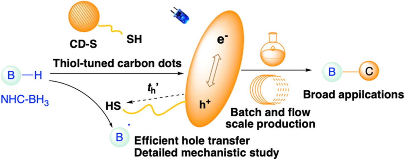 该研究团队开发了一类准均相碳点(CDs)光催化体系,实现了可见光吸收与氢原子转移(HAT)的双功能协同催化。通过分子水平的表面修饰策略,将巯基(–SH)单元精确锚定于CDs表面,显著加速激发态电荷分离并高效实现空穴转移。在该过程中,表面巯基作为空穴受体生成硫自由基,进一步与N-杂环卡宾–硼烷(NHC–BH₃)发生HAT反应,进而生成硼基自由基。基于此策略,成功推动了萘、吲哚、烯烃及多氟芳烃的硼化反应,在间歇与连续流条件下均能实现克级规模的有机硼化物合成,展现出良好的适用性和可扩展性。机理研究表明,巯基修饰是实现空穴转移驱动光催化的关键:它不仅促进了激发态CDs的高效电荷分离,也打破了传统CDs依赖电子转移的局限,释放了还原猝灭途径的潜力。该工作提出了一种全新的“分子调控–空穴转移”策略,拓展了CDs在光化学有机合成中的功能边界。