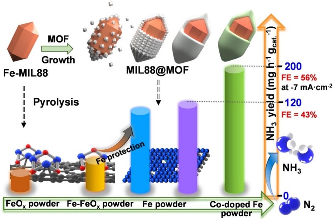 针对上述挑战,英国上市公司365陈玉贞教授团队提出一种新型壳保护策略通过MOF制备了体相铁金属电极材料。即精准调控反应温度、搅拌速率等工艺参数,在MIL88表面均匀外延生长异构的MOF保护壳层,煅烧时外层MOF不仅可原位消除MIL88中残余氧物种,形成的氮掺杂碳层可保护内部铁颗粒不被氧化,最终获得高纯多孔铁粉。所得多孔铁粉中丰富的铁空位增强了对氮气的吸附与活化能力;表面微环境实现了竞争性析氢反应的有效抑制;良好的抗氧化和耐酸性能增加了长期稳定性。电化学测试结果显示,该多孔铁粉在-0.24 V vs. RHE(可逆氢电极)电压下,氨产率达120.05 μg h-1 mgcat.-1,法拉第效率为43.44%,较商业铁粉提升超过20倍。打破了体相过渡金属在电催化NRR合成氨的性能限制。在此基础上,通过调控外层MOF中的金属中心,掺杂了少量钴物种构建出的钴掺杂的铁粉末在7 mA cm-2电流密度下,氨产率进一步提升至200.50 μg h-1 mgcat.-1,法拉第效率达56.34%。性能超越了大部分NRR电极材料。这一电流密度值在已报道的非贵金属NRR催化剂中处于较高水平,反映出材料在传质与反应动力学方面的显著优势。与常规体相金属电极材料相比,该多孔铁粉通过铁空位的可控构筑与表面化学环境的协同调控,在氮气活化与析氢抑制之间实现了更优平衡。该策略为开发其他对空气敏感但具有高活性的金属提供了新思路。同时,该研究为开发更多体相过渡金属以实现工业级绿色氨合成提供了指导。