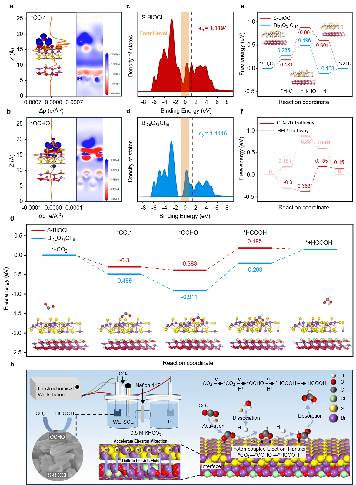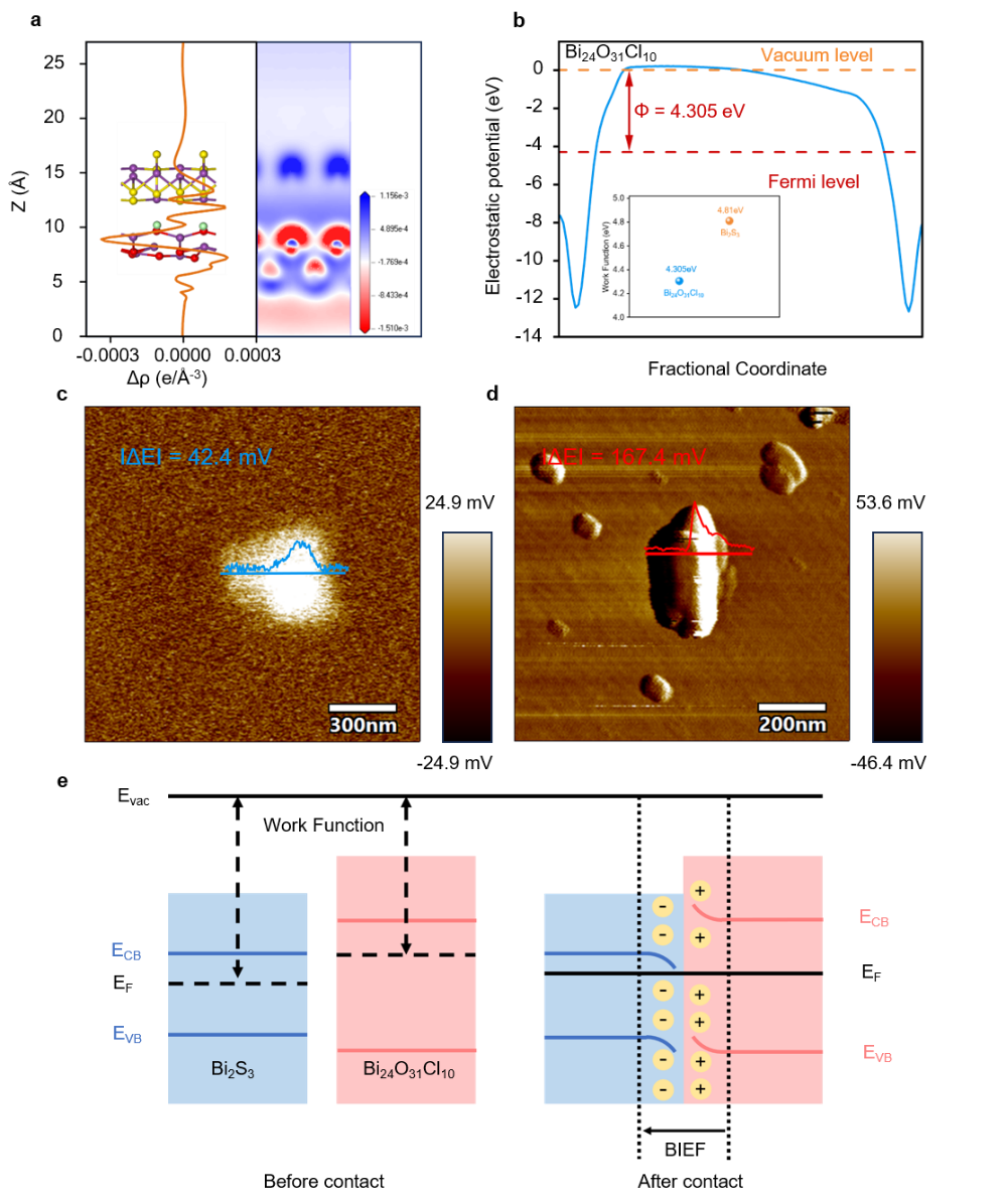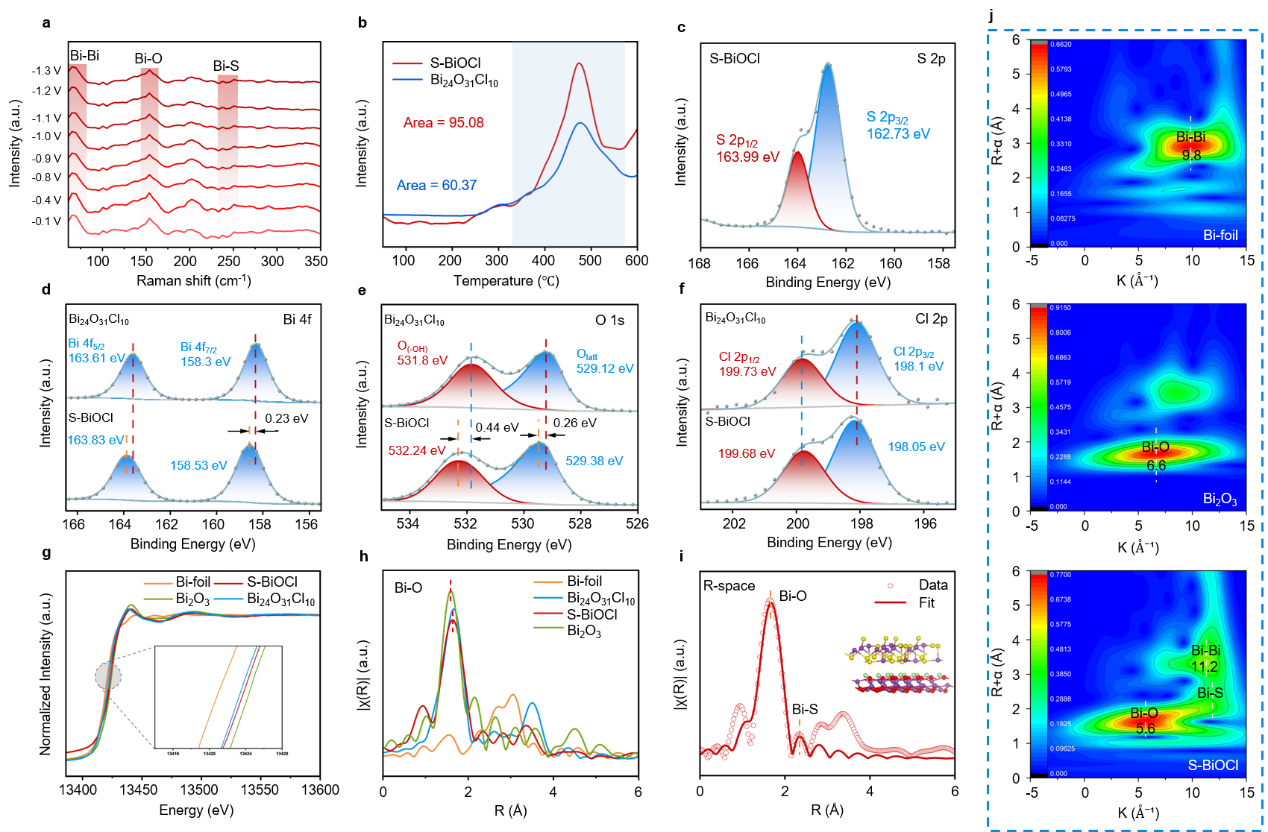 通过SEM,TEM,XRD, XPS, BET,KPFM,in situ Raman, in situ FTIR及同步辐射等表征方法证明,Bi2S3/Bi24O31Cl10连续界面处构筑的内建电场(BIEF)显著降低了界面电荷传输阻力,诱导电子向活性位点发生定向迁移。这种局域电子富集效应强化了对CO2分子的吸附与活化,加速CO2RR在S-BiOCl体系中的动力学过程。